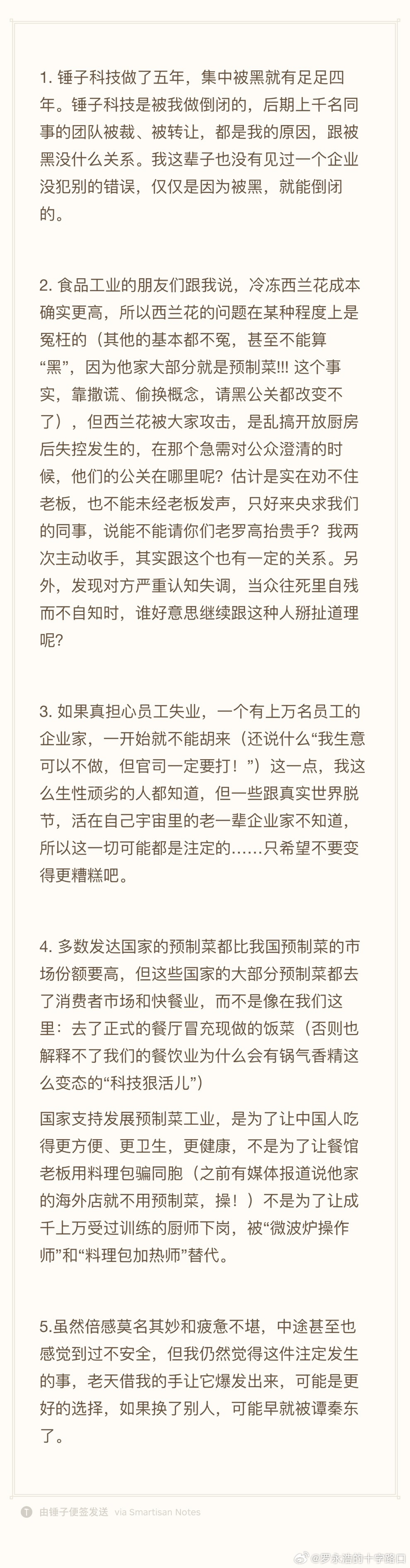 2. 食品工业的朋友们跟我说,冷冻西兰花成本确实更高,所以西兰花的问题在某种程度上是冤枉的(其他的基本都不冤,甚至不能算“黑”,因为他家大部分就是预制菜!!! 这个事实,靠撒谎、偷换概念,请黑公关都改变不了),但西兰花被大家攻击,是乱搞开放厨房后失控发生的,在那个急需对公众澄清的时候,他们的公关在哪里呢?估计是实在劝不住老板,也不能未经老板发声,只好来央求我们的同事,说能不能请你们老罗高抬贵手?我两次主动收手,其实跟这个也有一定的关系。另外,发现对方严重认知失调,当众往死里自残而不自知时,谁好意思继续跟这种人掰扯道理呢?